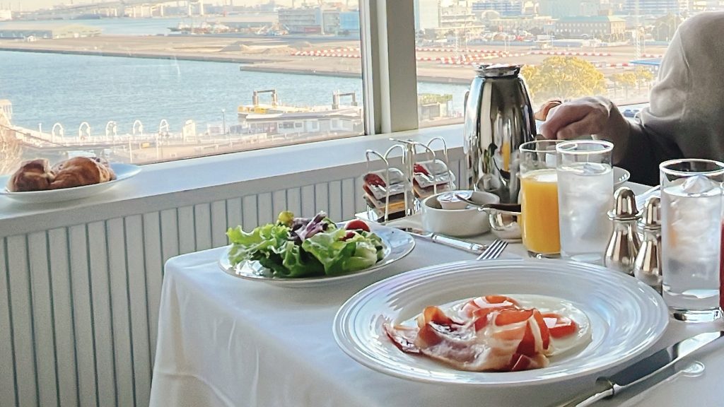 The accommodation plan allowed us to choose breakfast from a Western restaurant, a Japanese restaurant, or room service, so we opted for room service. Enjoying breakfast in pajamas while gazing at the expansive view of the sea was absolutely wonderful.