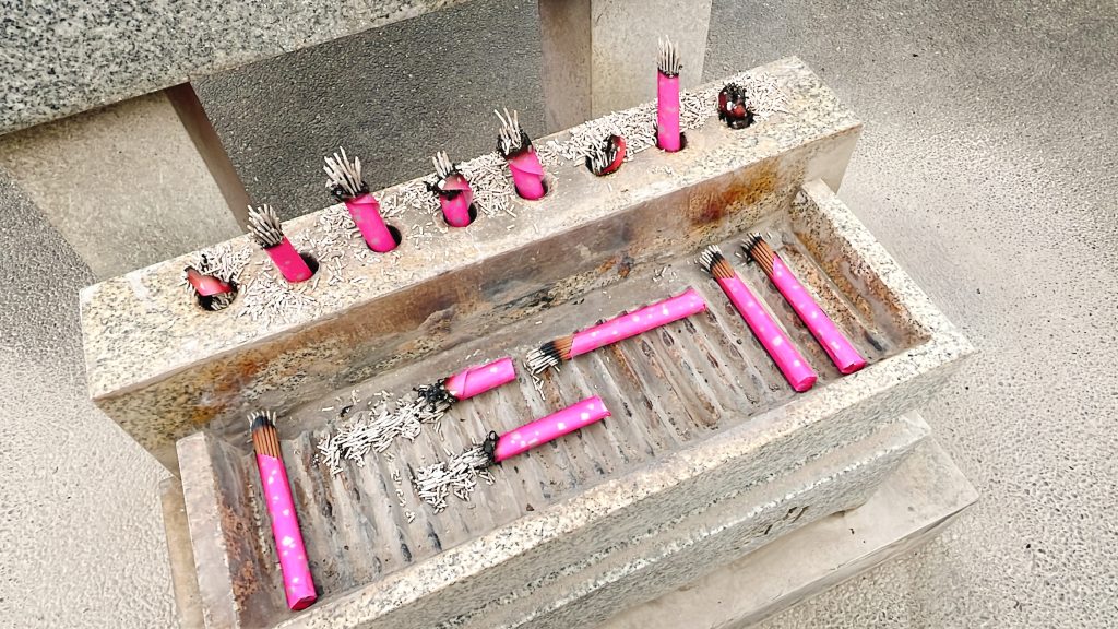 A set of two pieces of red paper and two bundles of lit incense sticks cost ¥320.