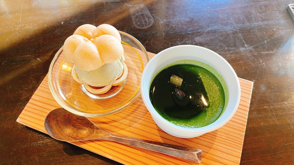 For dessert, you can choose from a variety of options. I tried the hojicha ice cream sandwiched between crisp monaka wafers and a smooth matcha pudding. Both were absolutely delightful, showcasing the delicate flavors of Japanese sweets.