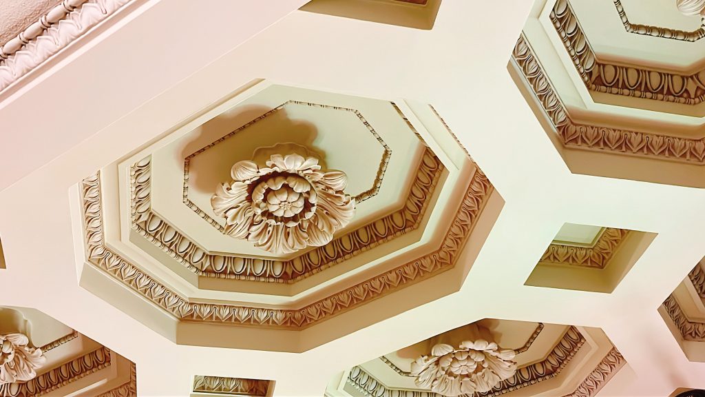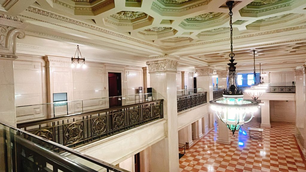 一般公開されているエリアでは、大理石をふんだんに使用した重厚な内装や、昭和初期のクラシックな意匠を間近で見ることができます。特に、エントランスホールの吹き抜けや、天井の装飾、アンティーク調の照明などは、当時の職人技を感じられるポイントです。