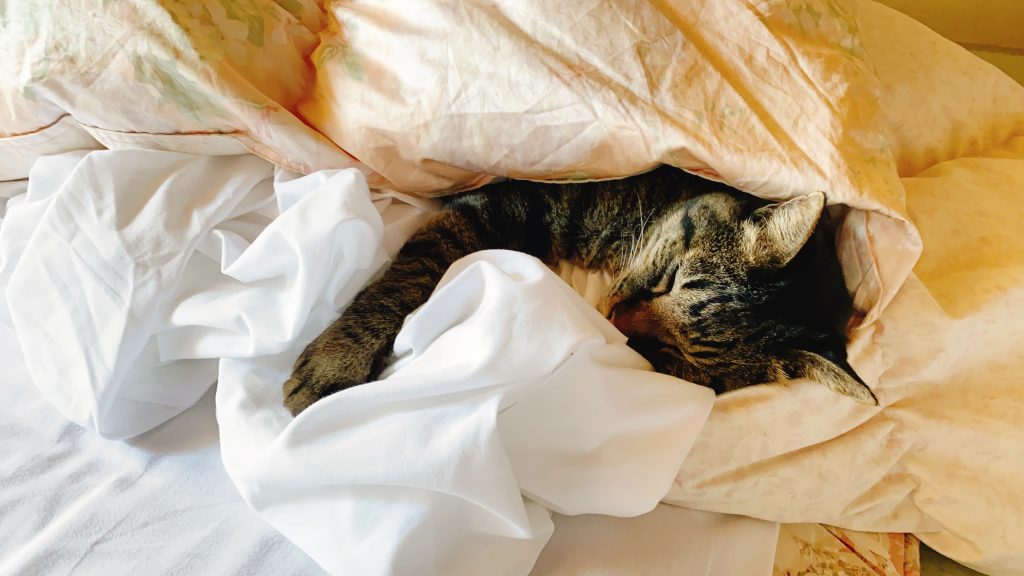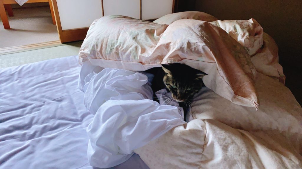 When I opened the door, he came into the room again without hesitation, climbed into the futon we were sleeping on, and began to sleep slightly or lay down where the sun shone and basked in the sun.