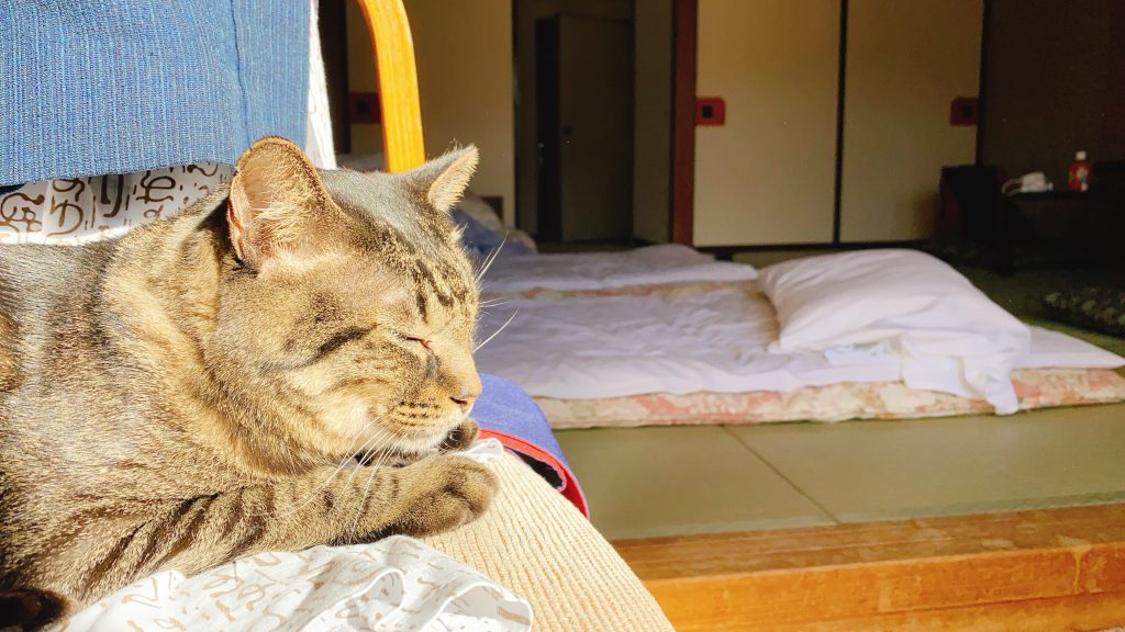 「おはよう」と言って開けると、また遠慮なく部屋に入ってきて、私たちが寝ていた布団に入り込んで微睡んだり、日が当たる場所で横になり日向ぼっこを始めました。