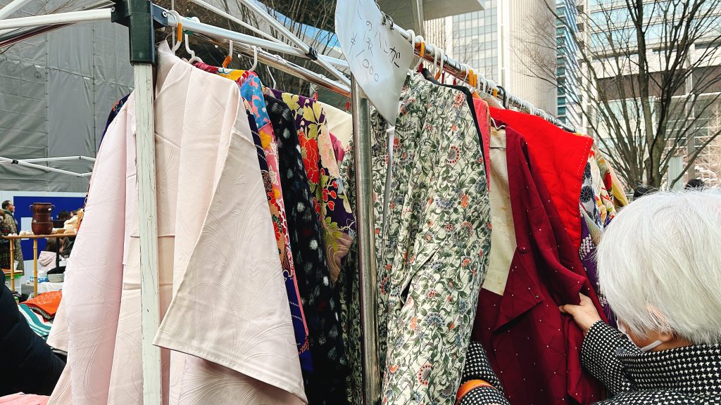 One of the highlights of the Oedo Antique Market is the remade kimono and obi items. Kimono remakesare a popular trend at this market, where old kimonos and obi (traditional Japanese belts) are reimagined into modern accessories.