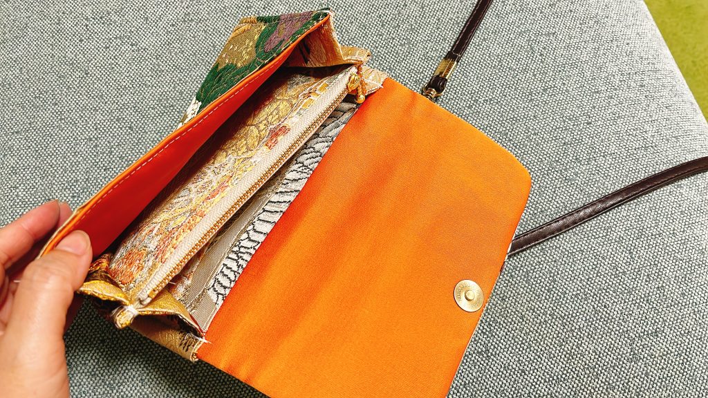 I personally purchased a remade obi pouch, which is both a wallet and a practical bag. The exterior is made from a beautiful obi, while the interior is decorated with various patterns, giving it a unique and vibrant look. It’s large enough to carry your smartphone, lipstick, and other essentials, making it a convenient and stylish accessory. Plus, the prices are often quite reasonable, making these remade items perfect for those seeking something both functional and beautiful.