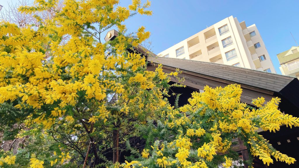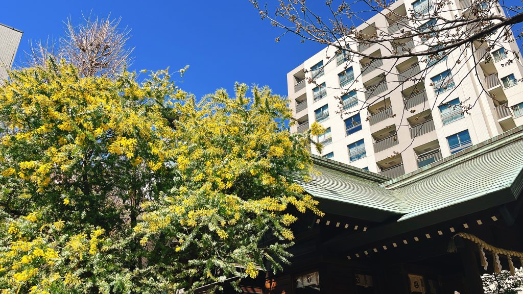 近年、境内の大きなミモザの木がSNSで話題となり、「東京のミモザの名所」としても知られるようになりました。