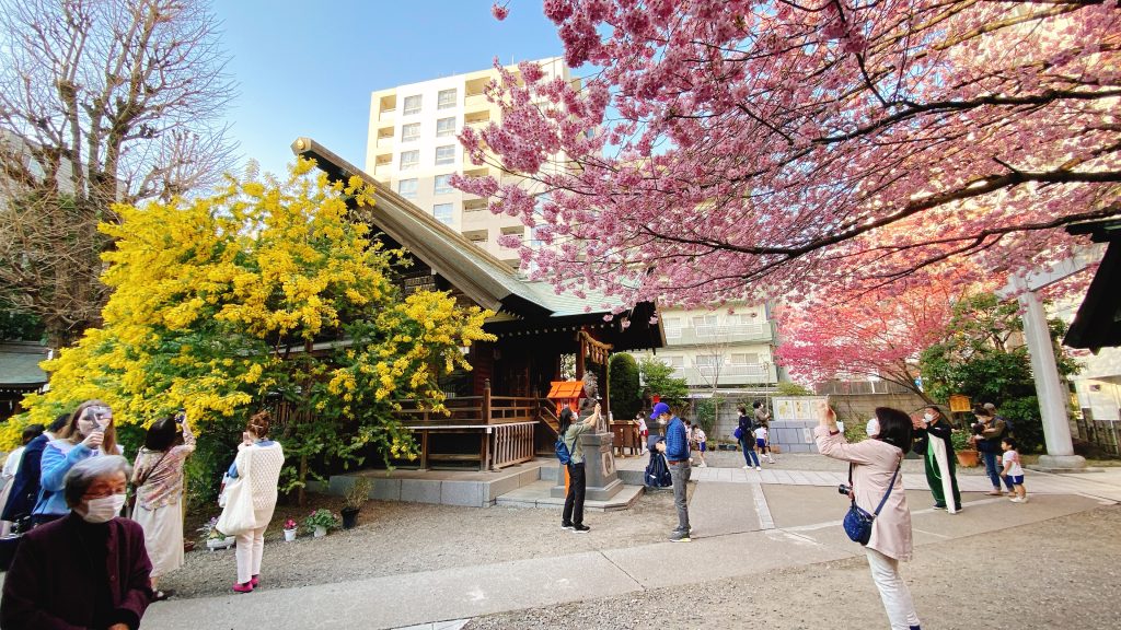 The bright yellow mimosa trees blooming in the shrine grounds and the pretty pink early-blooming cherry blossoms create a truly spectacular scene! It is said to be one of the most beautiful in Tokyo.