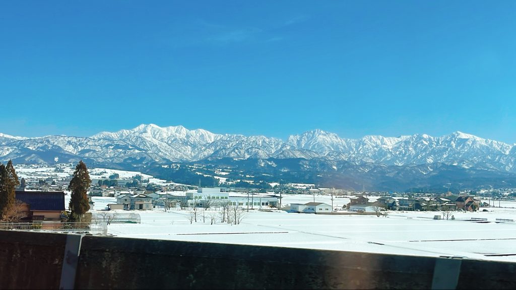 On a clear winter day, the snow-capped peaks of the Tateyama Mountain range can be clearly seen over the sea.