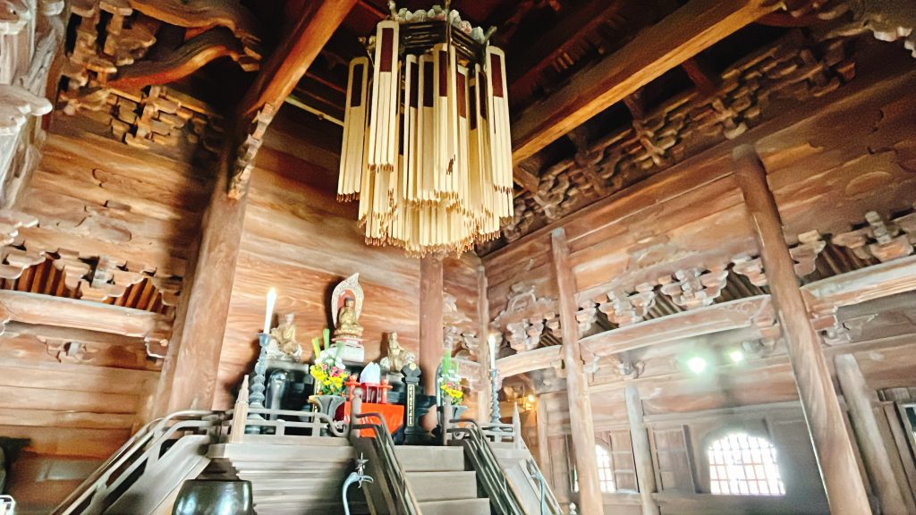鉛板葺きの仏殿屋根、檜と戸室石をふんだんに使った堂内、仏殿を囲むように左右対称に造られた回廊、美しい天井画など、見どころも満載。